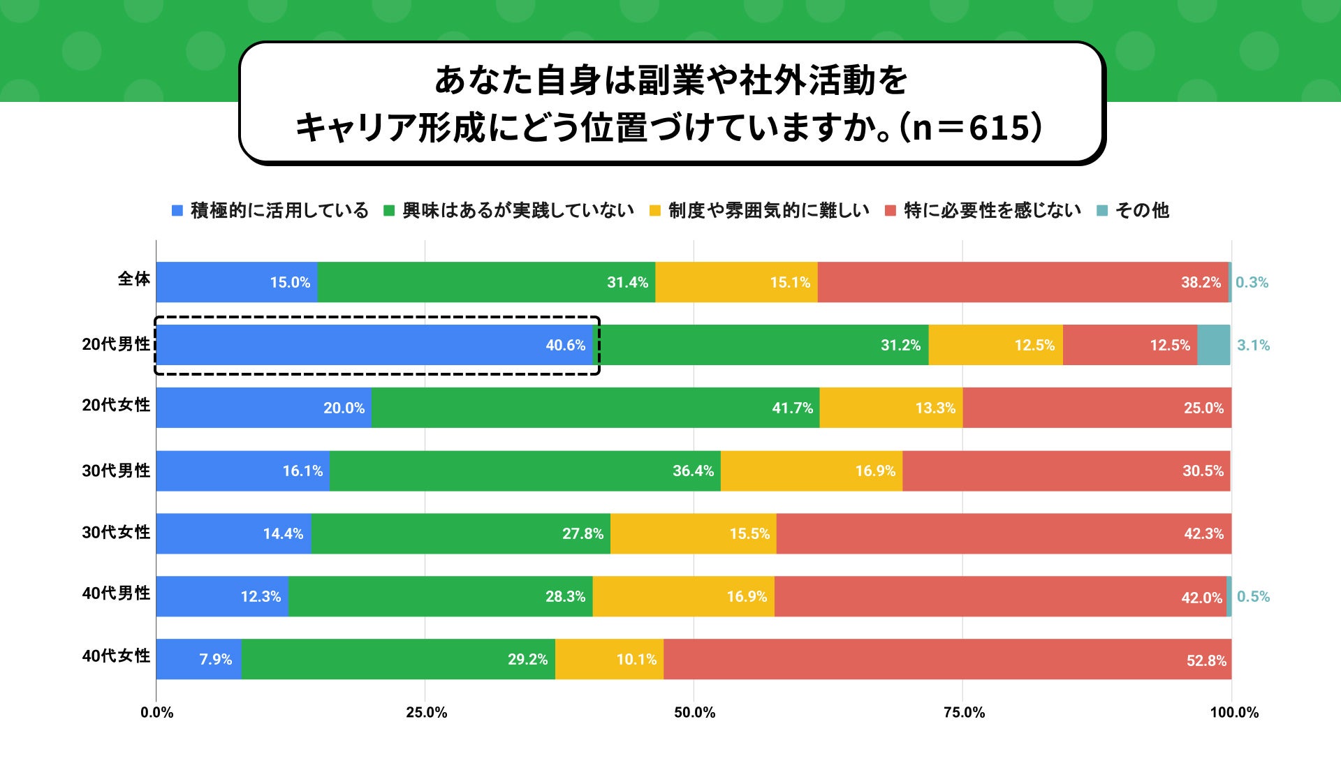 年代別で見ると、20代が最も副業や社外活動をキャリアにおいて重視しており、なかでも20代男性は「積極的に活用している」が40.6%と高く、他世代を大きく上回りました。一方で20代女性は「興味はあるが実践していない」が41.7%と最も多く、